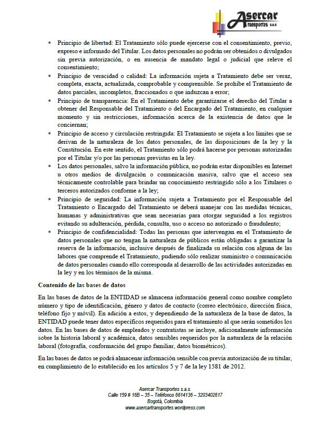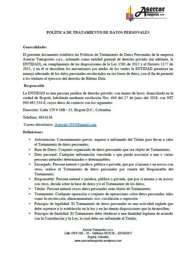 Política de tratamiento de datos personales Asercar Transportes s.a.s